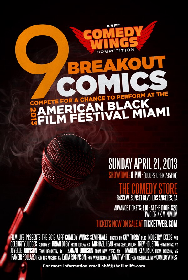 The Comedy Wings competition is American Black Film Festival’s national search for emerging comics. The goal of the competition is to provide a platform for talented yet undiscovered comedians to break into film and television. Nine semifinalists from around the country have been chosen to compete for a chance to perform at the Finals event (sponsored by HBO) during the 2013 American Black Film Festival in Miami. The Semifinals competition will be hosted by comedian and actor, Guy Torry in the main room of the Comedy Store in West Hollywood, CA.